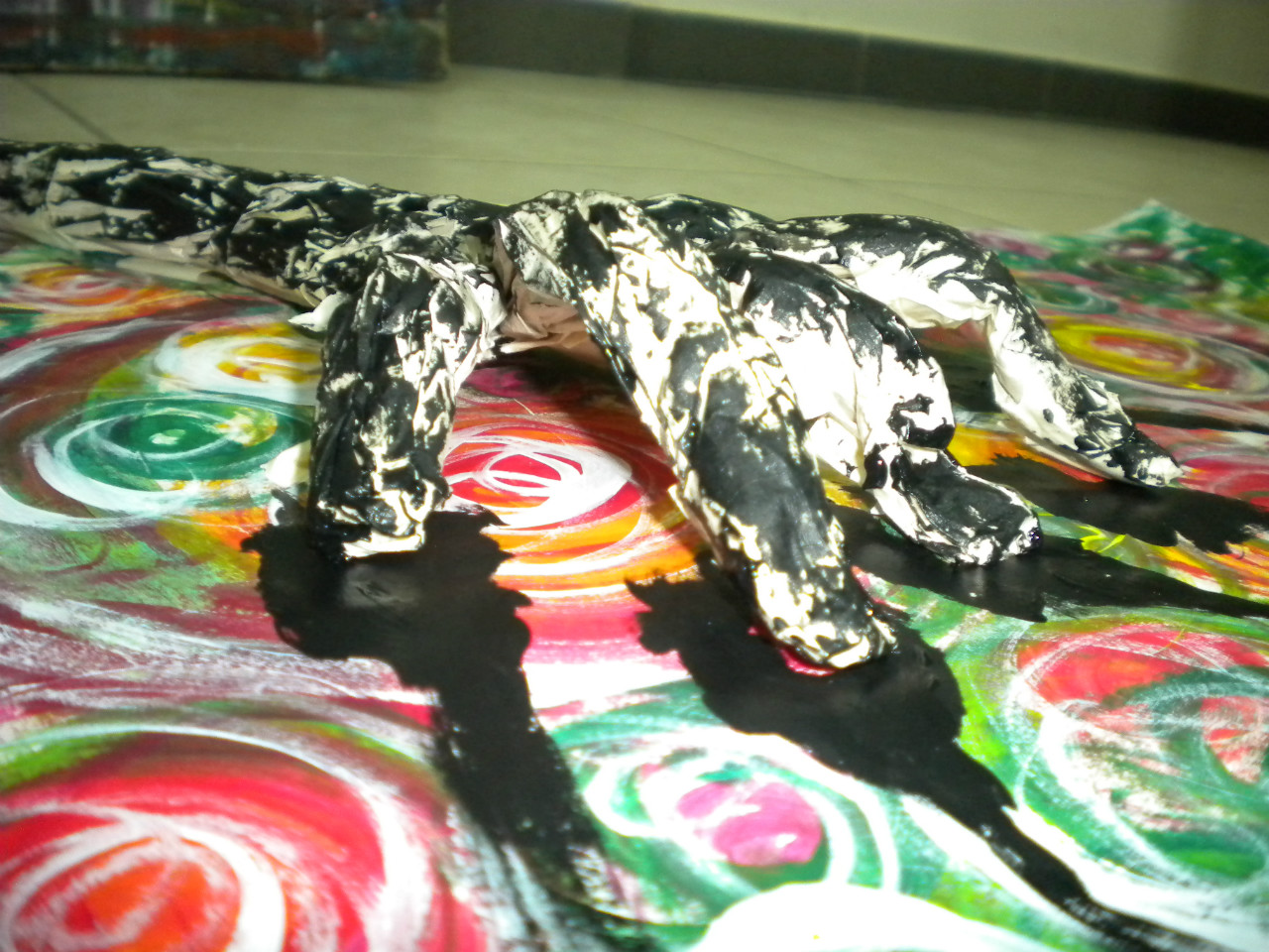 Twee bleke handen grijpen naar een gehavende pop. Griezelige slangen lijken greep te willen krijgen op deze pakbeweging. Het werk representeert een wankelmoment in het opgroeiproces van een jongvolwassenen. In gedachten grijpt ze terug naar een kindertijd die nooit meer zal terugkomen. De veiligheid van met poppen spelen op de mat van de huiskamer cirkelt als een verdwaalde gedachte door haar hoofd. Opgepakt worden, geknuffeld worden door mama… die liefdevolle aanrakingen worden onbereikbaar. Het besef dat de wereld groot en ruw brengt schreeuwende gedachten in haar hoofd.